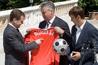 Президент России Дмитрий Медведев, главный тренер сборной России по футболу Гус Хиддинк и игрок сборной Сергей Семак во время встречи в подмосковной резиденции Майндорф