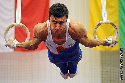 Спортсмен Максим Девятовский на соревнованиях чемпионата и Кубка России по спортивной гимнастике во дворце спорта "Лобня"