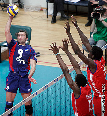 Игрок сборной России Александр Абросимов (слева) в матче этапа мировой лиги по волейболу: сборная России - сборная Кубы – 3:1