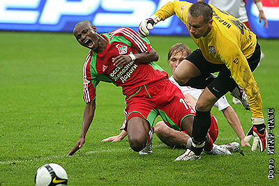 Игрок "Локомотива" Драман Траоре и вратарь "Амкара" Сергей Нарубин (слева направо) в матче чемпионата России между командами "Локомотив" (Москва) - "Амкар" (Пермь) – 0:1