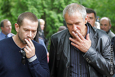 Актеры Владимир Машков и Сергей Гармаш на церемонии прощания с актрисой Нонной Мордюковой на Кунцевском кладбище