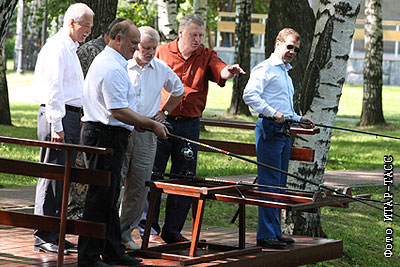 Спикер Государственной думы РФ, председатель "Единой России" Борис Грызлов, председатель КПРФ Геннадий Зюганов, спикер Совета Федерации РФ, лидер "Справедливой России" Сергей Миронов, лидер ЛДПР Владимир Жириновский и президент России Дмитрий Медведев во время рыбалки в резиденции Завидово