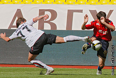 Игрок "Москвы" Станислав Иванов и армеец Алан Дзагоев (слева направо) в матче чемпионата России по футболу: ЦСКА (Москва) - "Москва" (Москва)