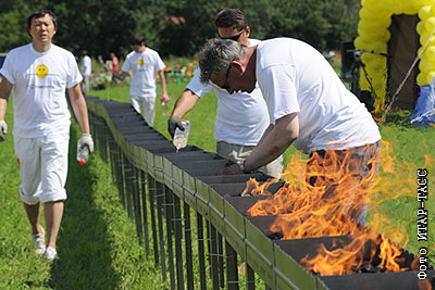Подготовка мангала длиной в 102 метра, установленном на территории яхт-клуба "Новый берег" в Мытищинском районе, к жарке сосисок