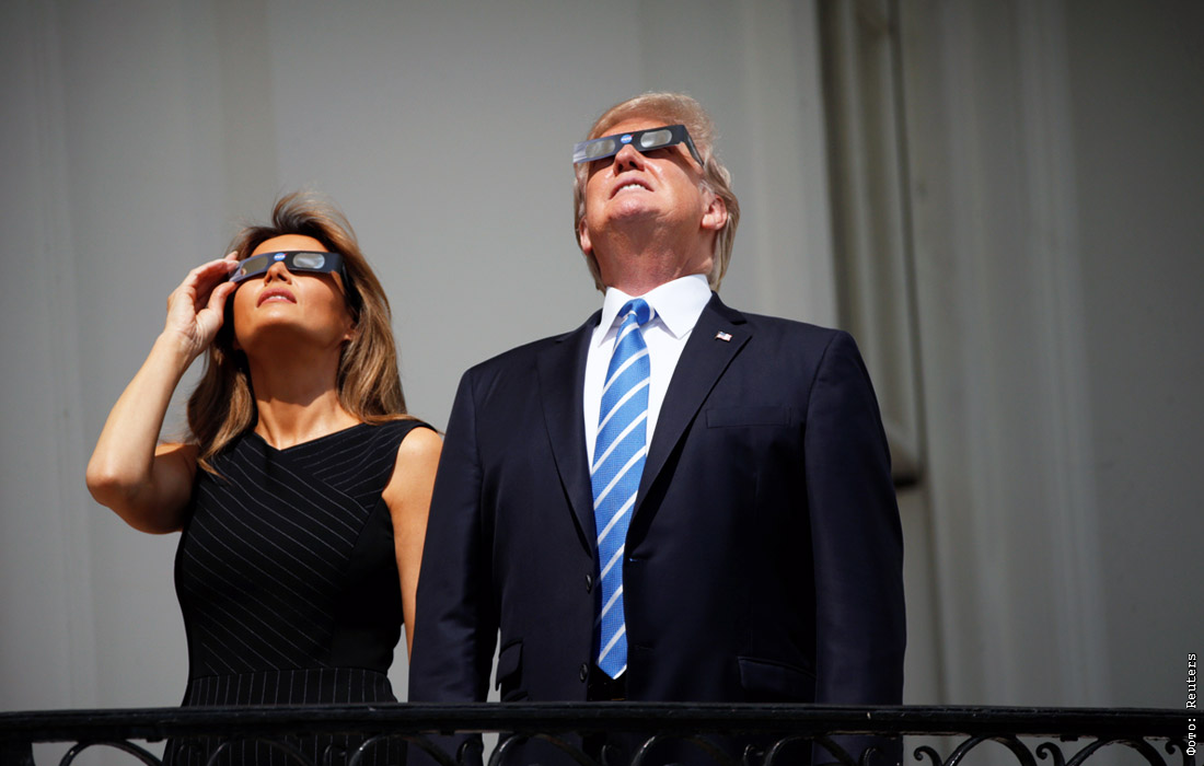 Президент США Дональд Трамп и первая леди Мелания Трамп наблюдали за затмением с балкона Белого дома. К президентской чете присоединились другие высокопоставленные представители американской администрации.