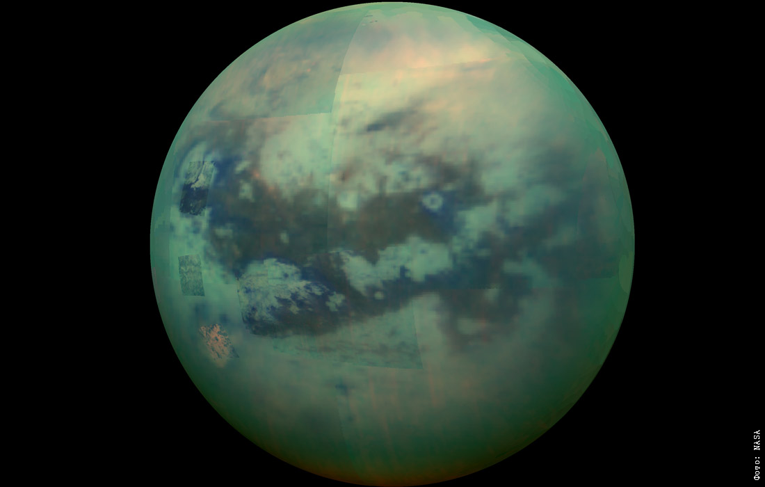 Титан, самый крупный из 62 спутников Сатурна. На снимке, сделанном с расстояния около 500 тыс. км от поверхности спутника, видны углеводородные озера и моря, над которыми наблюдаются полосы метановых облаков