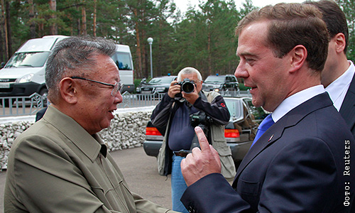 Улан-Удэ. 24 августа 2011г. Президент России Дмитрий Медведев и председатель КНДР Ким Чен Ир после переговоров на территории военного гарнизона "Сосновый бор".