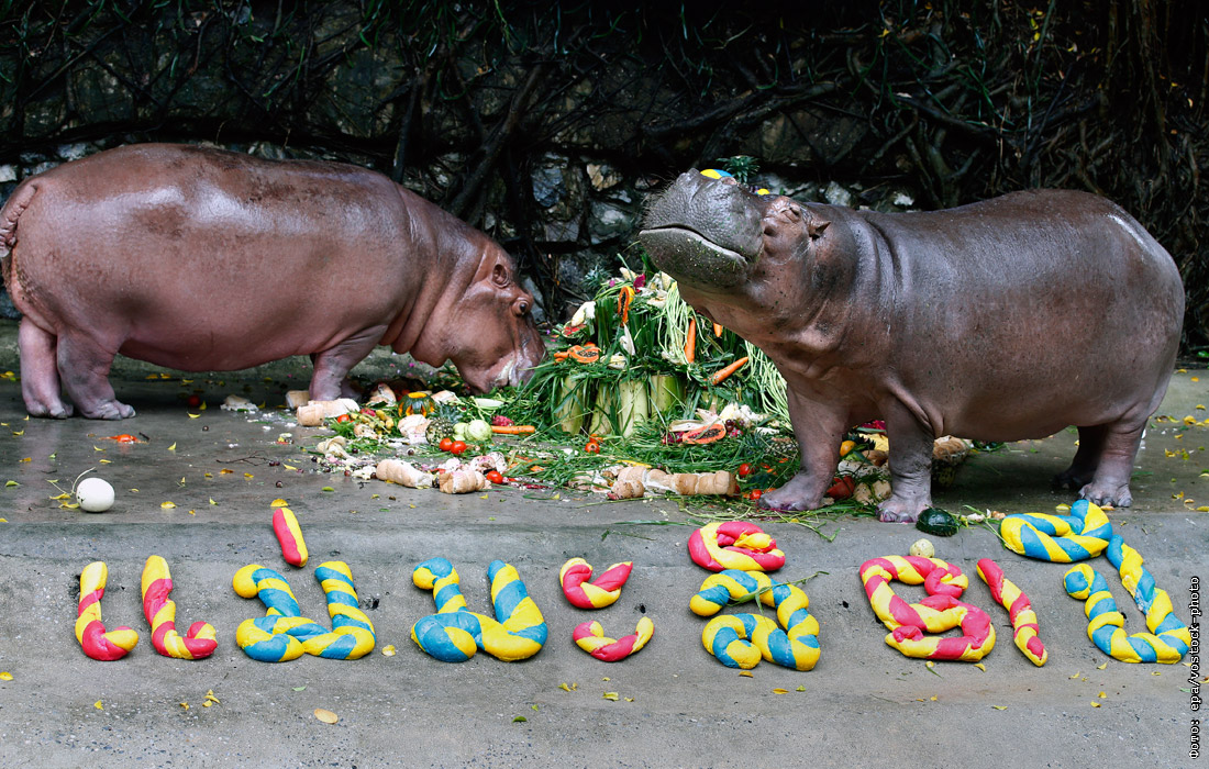 В зоопарке "Дусит" в Бангкоке отметили 51-й день рождения бегемота Мали (на фото справа). В честь этого события работники зоопарка приготовили имениннице торт из овощей.