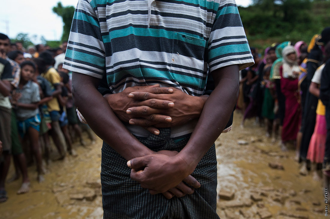 Беженцы-рохинджа в очереди за едой в лагере беженцев в Бангладеш