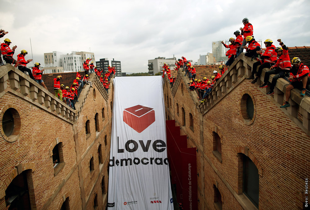 Пожарные в Барселоне растянули огромный баннер на территории музея истории Каталонии в поддержку предстоящего референдума о независимости 1 октября