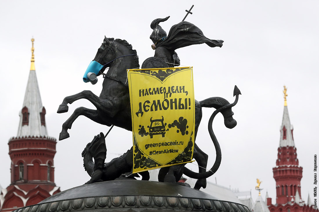 Активисты "Гринпис" надели противогазы на памятник Георгию Победоносцу на Манежной площади в Москве