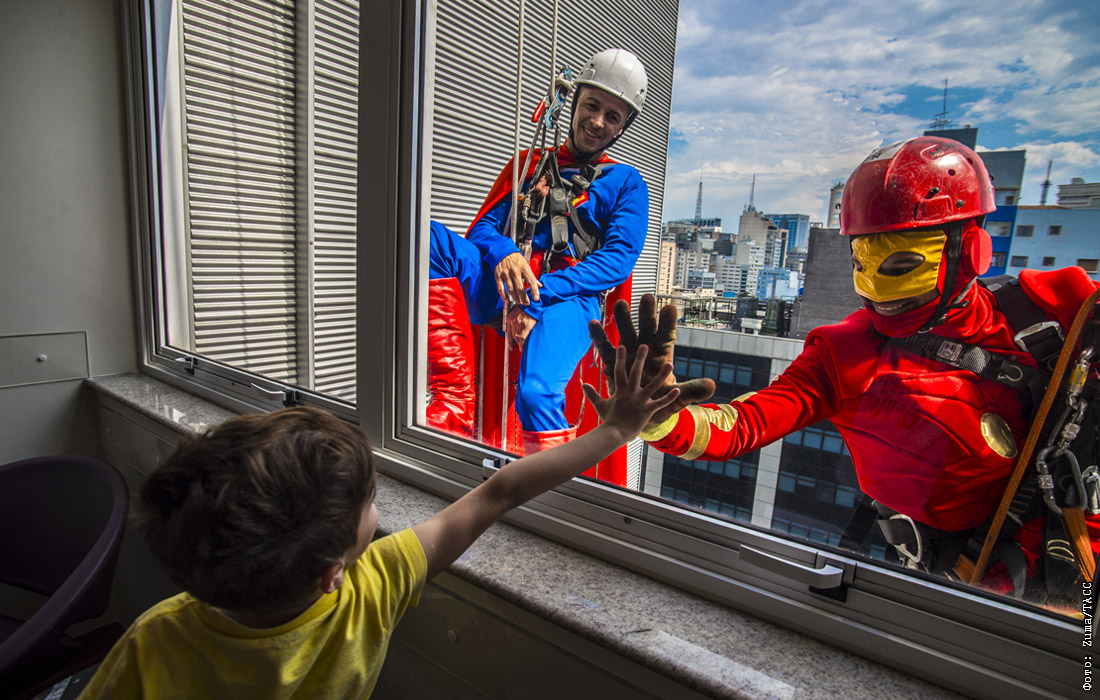 Юный пациент приветствует переодетых в супергероев мойщиков окон в больнице Сан-Паулу. Бразилия.