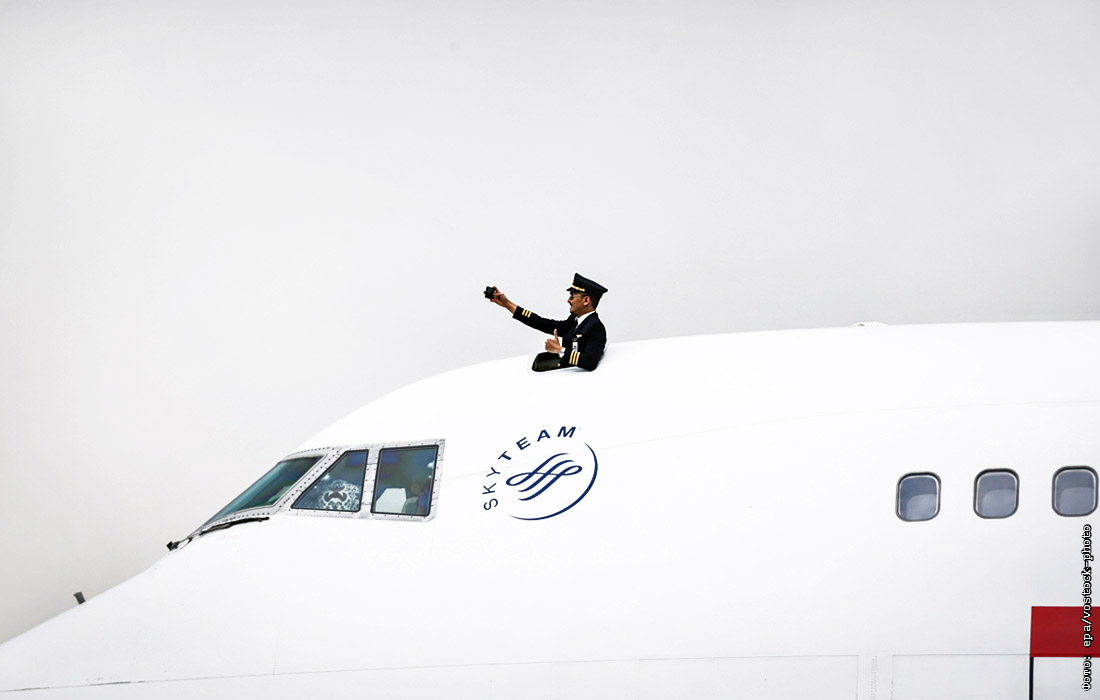 Пилот самолета Boeing 747-400 делает селфи в аэропорту Тангеранга. Индонезия.