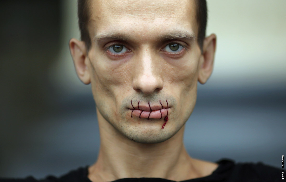 Свою первую громкую акцию Петр Павленский провел 23 июля 2012 года после приговора участницам группы Pussy Riot за организацию панк-молебна в храме Христа Спасителя. Зашив рот ниткой, Павленский в течение полутора часов стоял в одиночном пикете в Санкт-Петербурге у Казанского собора.