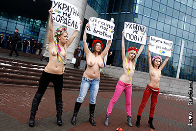 Активистки движения Femen вышли на улицы Киева, чтобы протестовать против заявлений Виктора Януковича, сделанных в Давосе