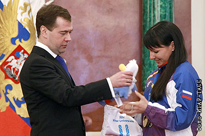 Дмитрий Медведев и двукратная чемпионка по лыжным гонкам Алия Иксанова с памятным знаком Универсиады и игрушкой-символом победы, на церемонии поздравления спортсменов, завоевавших медали на Универсиаде в Турции