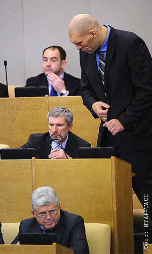 Депутат Госдумы РФ Николай Валуев (справа) на первом пленарном заседании Государственной Думы РФ шестого созыва.
