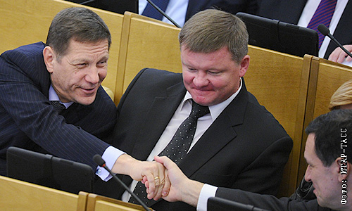 Депутаты Госдумы РФ Александр Жуков (слева) и Андрей Макаров (справа) на первом пленарном заседании Государственной Думы РФ шестого созыва.