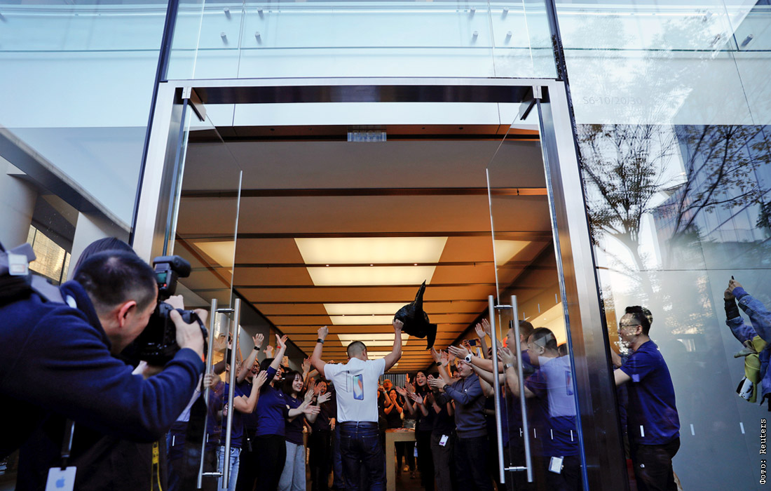 Работники магазина в Пекине приветствуют первого покупателя нового iPhone