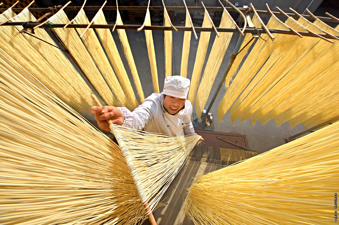 Сушка лапши в деревне китайской провинции Шаньдун