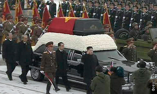 Телевизионная картинка продемонстрировала катафалк с телом Ким Чен Ира, который пешком сопровождал его младший сын и наследник Ким Чен Ын.