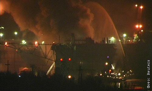 В доке ФГУП Судоремонтный завод номер 82, принадлежащем Министерству обороны РФ, произошел пожар на АПЛ "Екатеринбург": при проведении рабочими огневых работ воспламенились деревянные леса вокруг корпуса подводной лодки, находящейся в плановом доковом ремонте. Возгорание перекинулось на внешний корпус подлодки