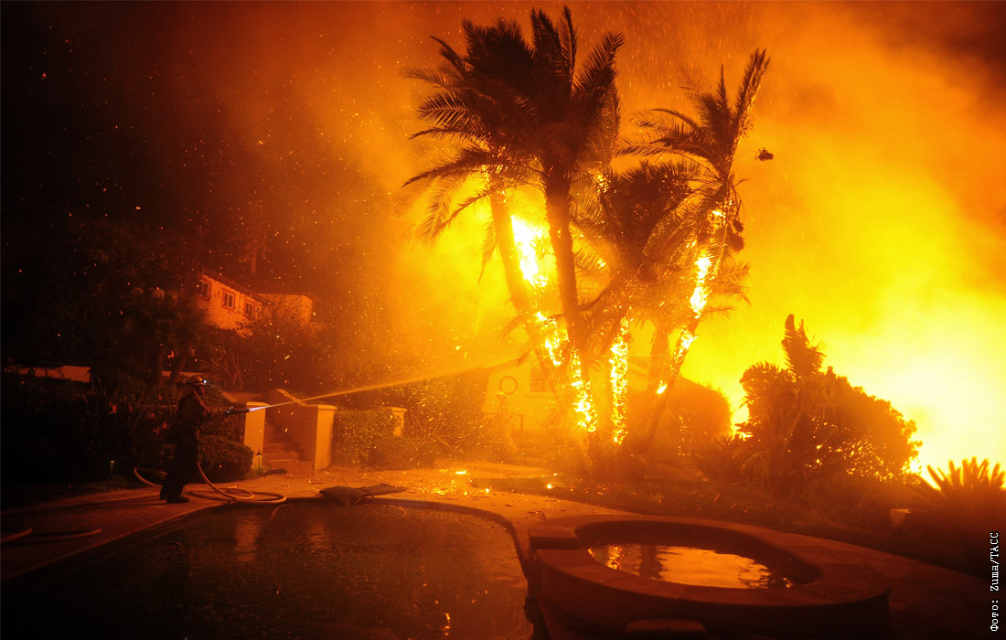 Природные пожары бушуют в четырех районах южной части Калифорнии. Власти округа Лос-Анджелес установили самый высокий в истории уровень опасности.