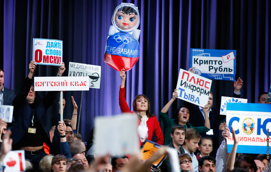 В Москве прошла традиционная пресс-конференция президента РФ Владимира Путина, в рамках которой он отвечал на вопросы представителей прессы. Журналисты пытались привлечь внимание главы государства с помощью специально изготовленных плакатов. Многие из них подошли к вопросу весьма креативно, однако задать вопрос президенту удалось далеко не всем.