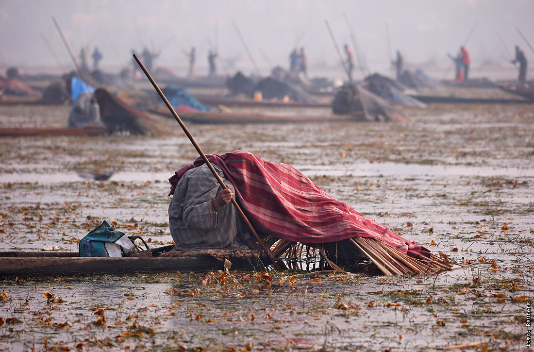 Рыбаки на озере Анчар. Шринагар, Индия.