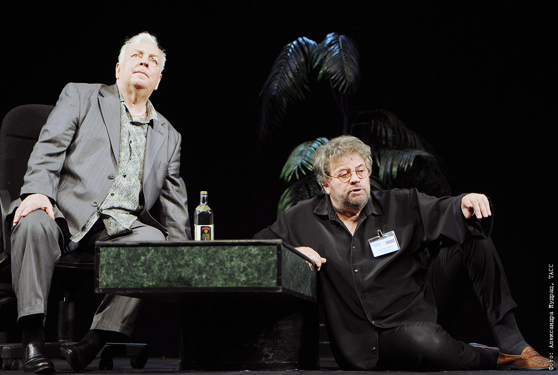 Актер Михаил Державин и художественный руководитель театра Сатиры Александр Ширвиндт в сцене из спектакля "Привет от Цюрупы!", показанного в честь 75-летнего юбилея Державина. 2011 год.