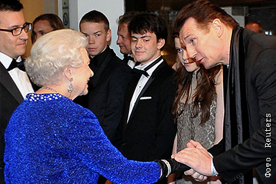 Королева Елизавета и актеры, сыгравшие в фильме "Хроники Нарнии: Покоритель Зари", на премьере в Лондоне