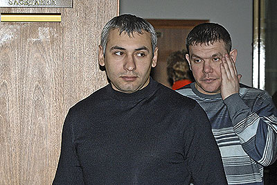 Бывшие сотрудники службы безопасности компании "Евросеть" Алексей Олесик и Владимир Ильин (слева направо), обвиняемые в причастности к похищению экспедитора компании Андрея Власкина, после вынесения оправдательного приговора в Мосгорсуде