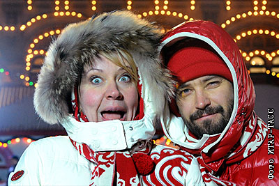 Телеведущая Татьяна Лазарева и солист группы "Uma2rmaН" Владимир Кристовский на открытии ГУМ-Катка на Красной площади