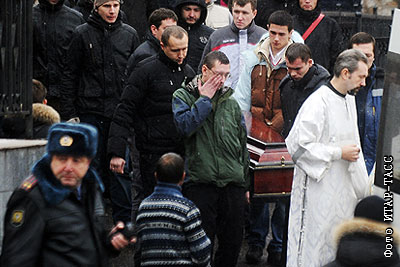 После церемонии отпевания в храме Андрея Первозванного болельщика ФК "Спартак" Егора Свиридова, убитого Асланом Черкесовым 6 декабря 2010 года