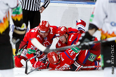 Игроки "Локомотива" Александр Калянин, Виталий Аникеенко, Геннадий Чурилов (слева направо) в матче чемпионата КХЛ: "Локомотив" (Ярославль) - "Северсталь" (Череповец) – 8:2