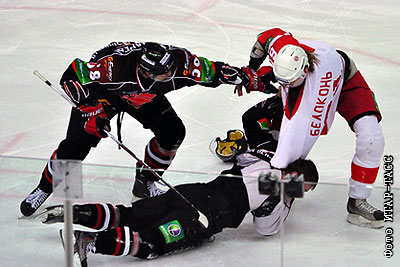 Игроки "Авангарда" Алексей Бондарев (слева) и "Витязя" Сергей Белоконь (справа) во время драки на матче чемпионата КХЛ: "Авангард" (Омск) - "Витязь" (Чехов) - 3:2