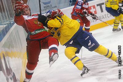 Игроки сборных России Александр Галимов и Швеции Роберт Нильссон (слева направо) в матче хоккейного турнира "Кубок Первого канала": Россия – Швеция