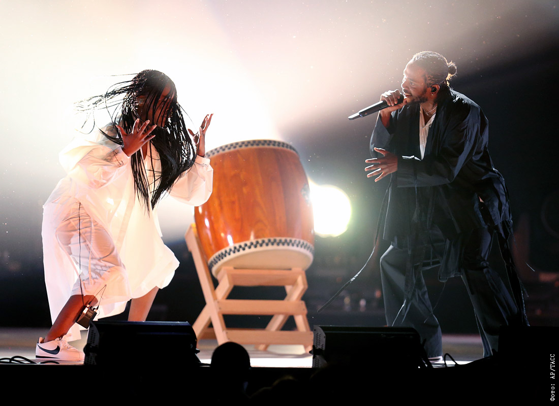 Хип-хоп исполнитель Кендрик Ламар (справа) во время выступления