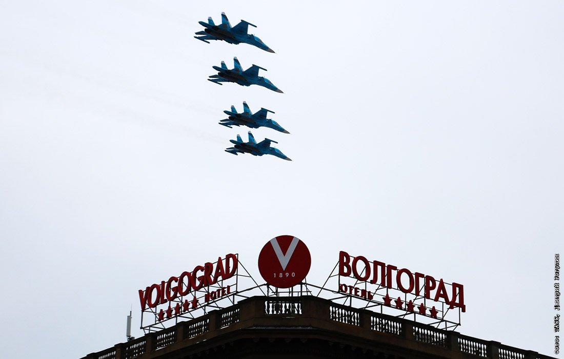 Многофункциональные бомбардировщики-истребители Су-34 во время военного парада в Волгограде