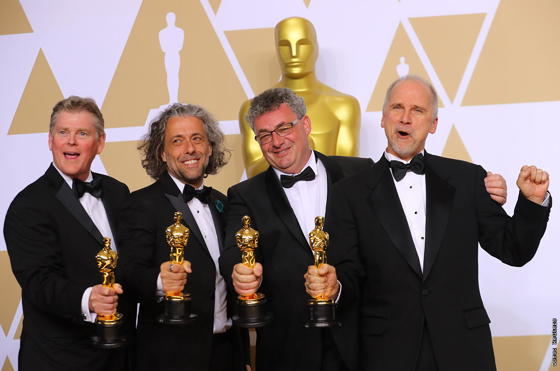 Ричард Гувер, Пол Ламберт, Герд Нефцер и Джон Нельсон (слева направо), с наградами за "Лучшие визуальные эффекты" в фильме "Бегущий по лезвию 2049"