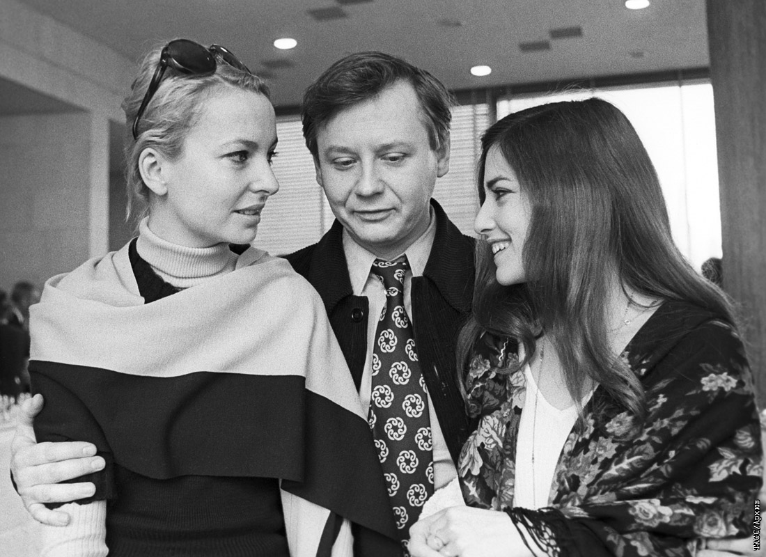 Олег Табаков с французскими актрисами Женевьевой Казиль (слева) и Франсуаз Фалькон во время приема, посвященного гастролям в СССР французского театра "Комеди Франсез". 1973 год.