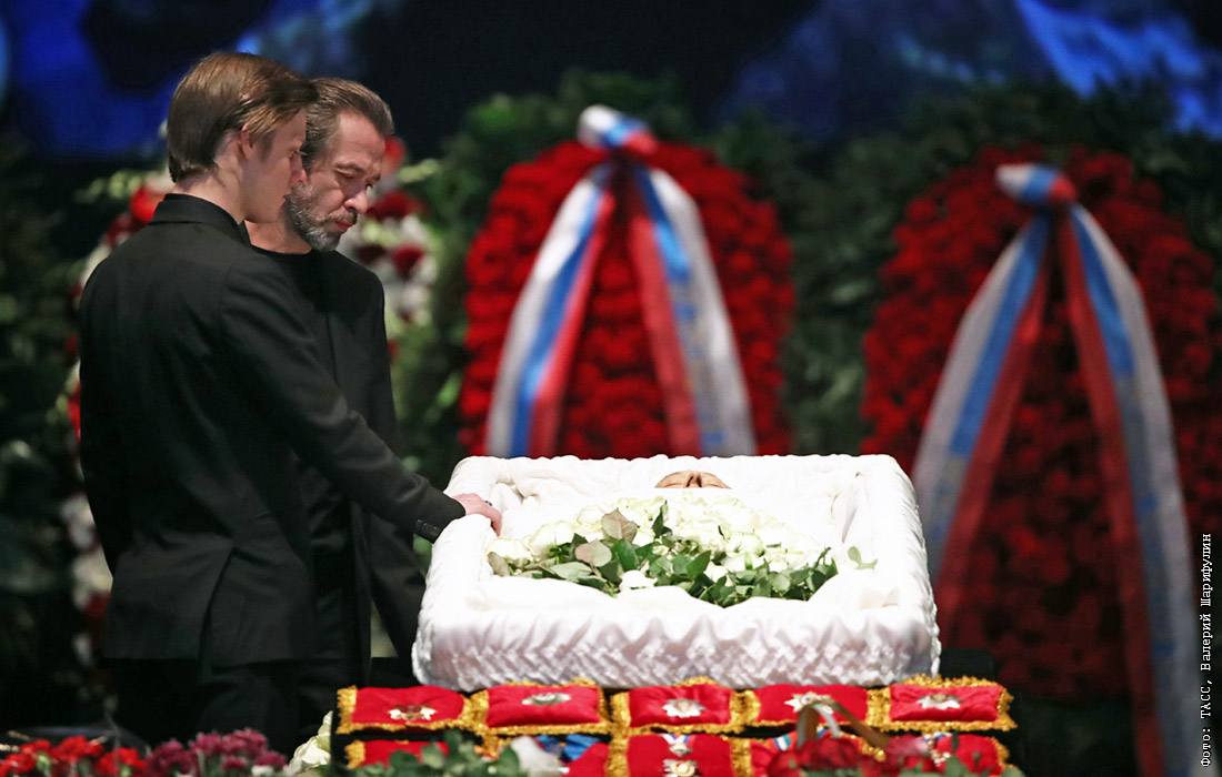 Сын Олега Табакова актер Павел Табаков и актер Владимир Машков во время церемонии прощания