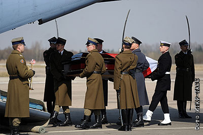 Гроб с телом президента Польши Леха Качиньского, погибшего в результате авиакатастрофы в Смоленской области, перед отправкой в Варшаву на транспортном самолете ВВС Польши