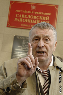 Лидер ЛДПР, вице-спикер Госдумы Владимир Жириновский, который является ответчиком по иску мэра Москвы Юрия Лужкова о защите чести и достоинства, у здания Савеловского районного суда