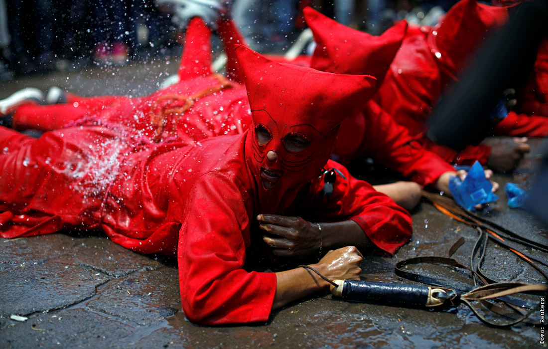Верующих в масках дьявола обливают водой по местной традиции в день начала Страстной недели в Тексистепеке, Сальвадор