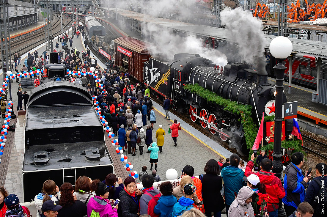 Ретропоезд "Победа" во время прибытия на железнодорожный вокзал Владивостока в рамках празднования 73-й годовщины Победы в Великой Отечественной войне