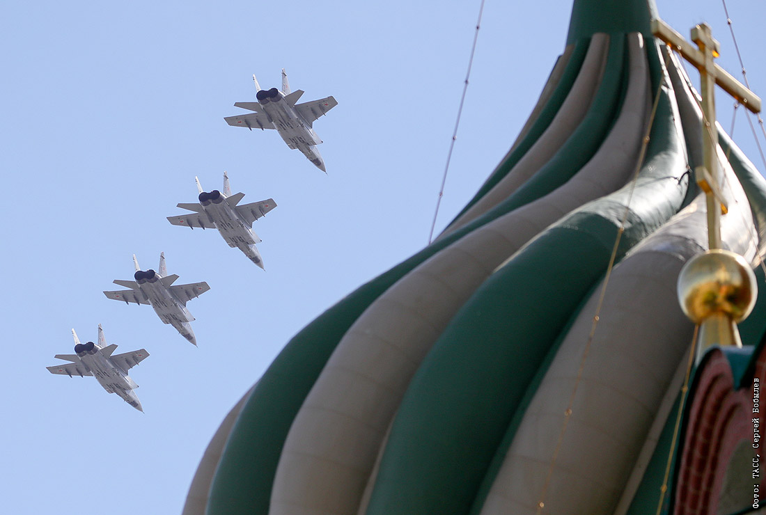 Сверхзвуковые истребители-перехватчики МиГ-31. В воздушной части парада полеты самолетов проходили на высоте от 300 до 500 м и скорости до 600 км/ч
