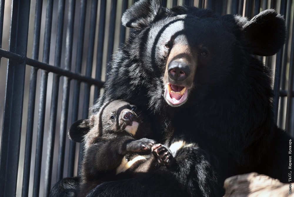 Новорожденный гималайский медвежонок с мамой в Новосибирском зоопарке
