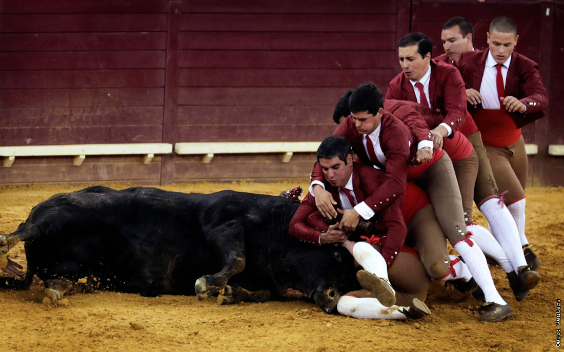 Матадоры во время схватки с быком в португальской вариации корриды - Тораде на арене Кампо-Пекено в Лиссабоне