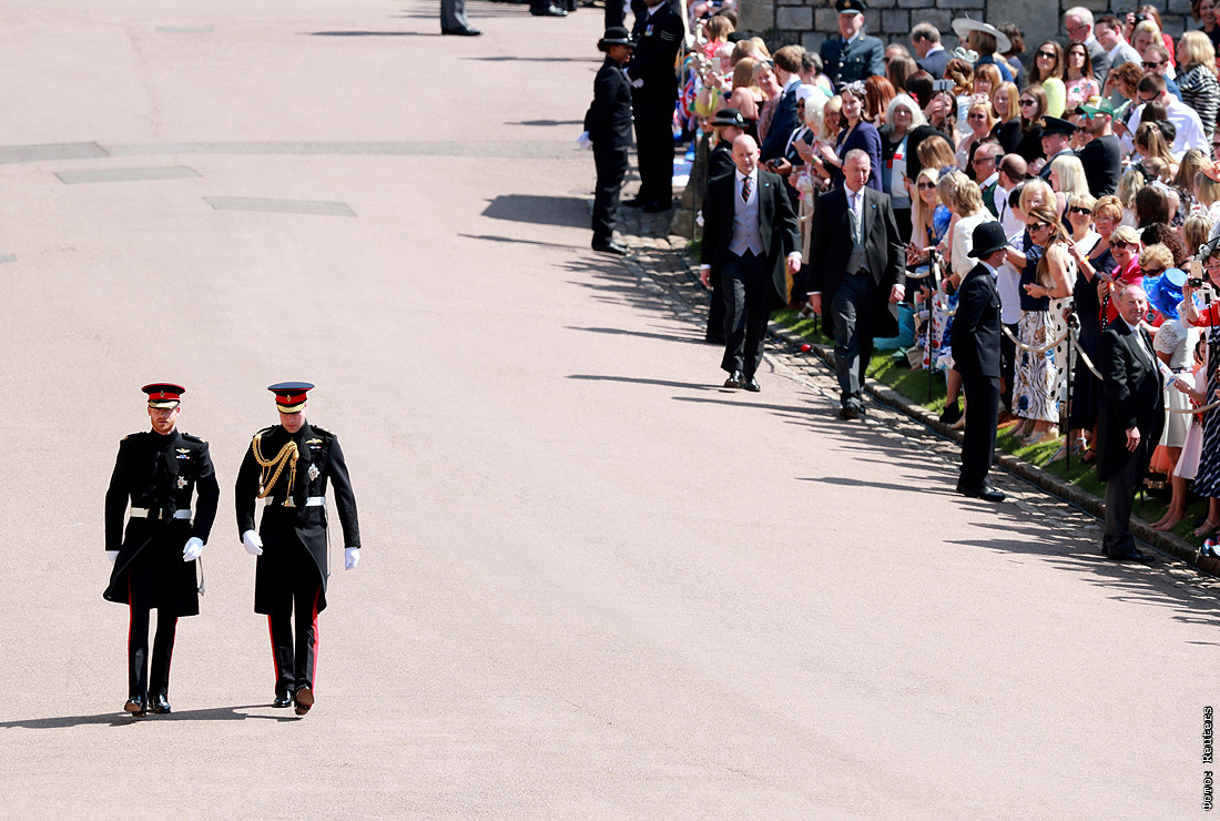 Принца Гарри (слева) к месту бракосочетания в часовне Святого Георгия сопровождал его брат и шафер принц Уильям (справа)